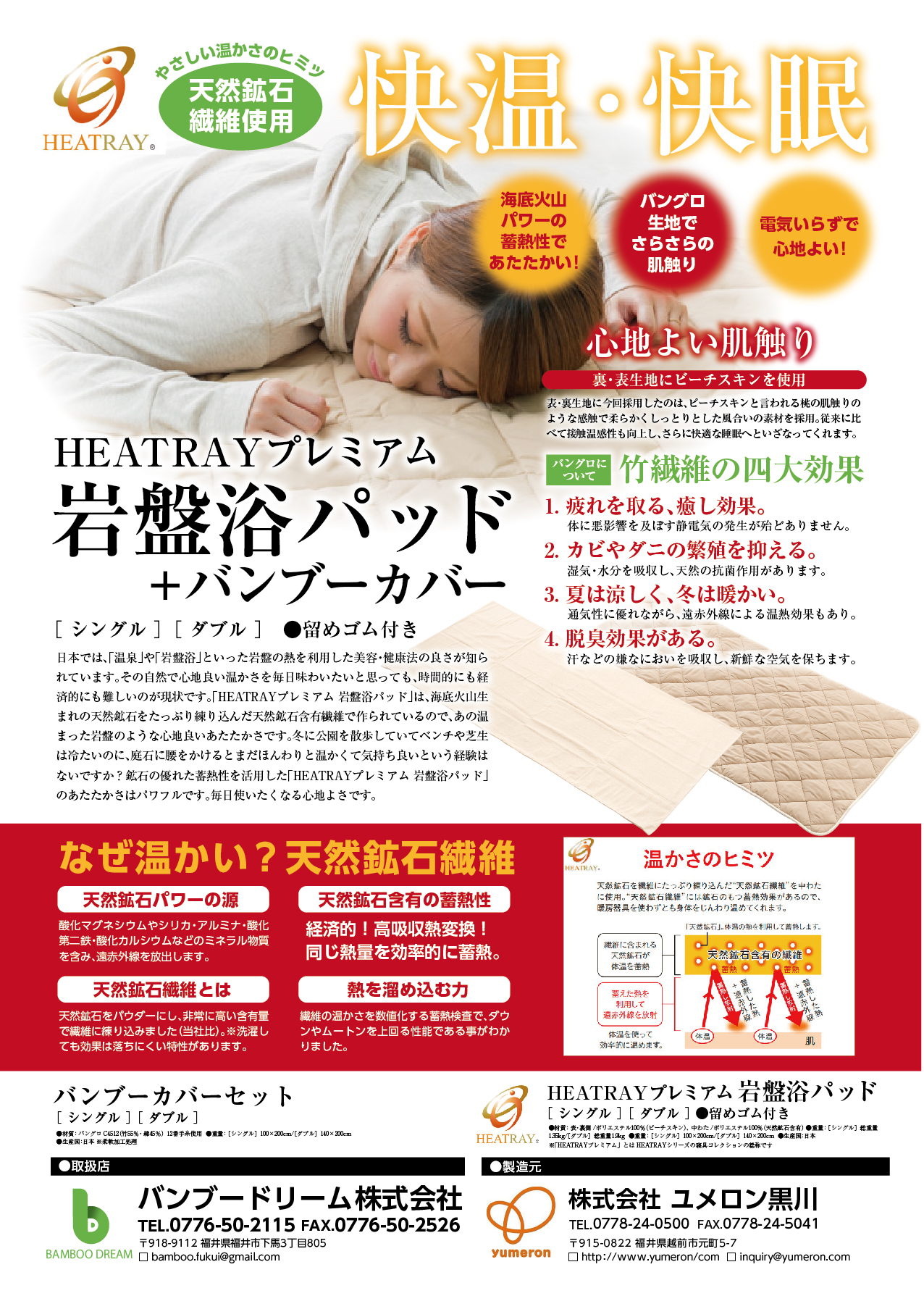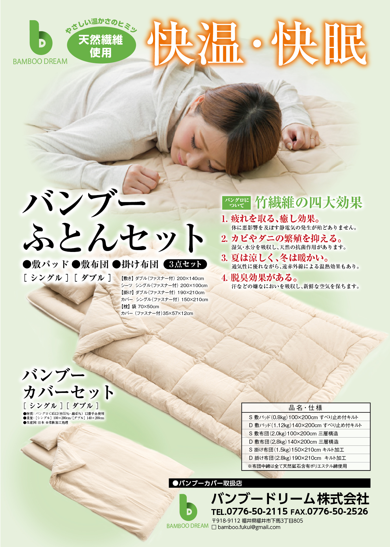 - 竹繊維加工の特許技術を活かし、竹繊維という完全天然素材を使用した新しい寝具を開発し、健康グッズ等を取り扱い販売をしております。福井初の技術が生み出す高性能の寝具を生活者にお届けします。