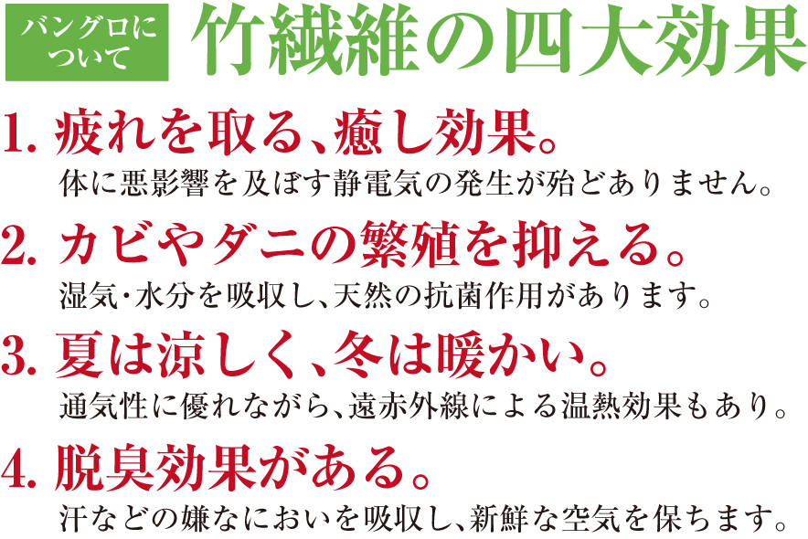 バンブーカバーにはバングロが使用されています。天然の竹を開繊し、繊維のみを細かく取り出し、竹繊維と他の繊維とを混紡した糸の総称です。中国四川省からベトナム、ラオス等の分布生息する、細かくて柔らかい慈竹を使用しています。