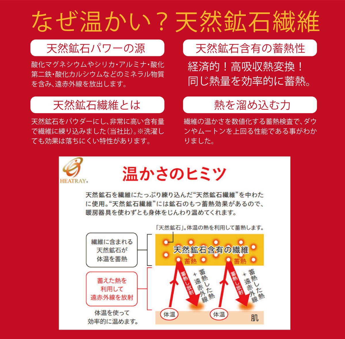 温かさのヒミツは、中わたに使用している「天然鉱石繊維」。遠赤外線を放射する厳選の天然鉱石の蓄熱効果で"自分で自分を温める"、じんわり心地よい自然な温かさを生み出す蓄熱素材です。