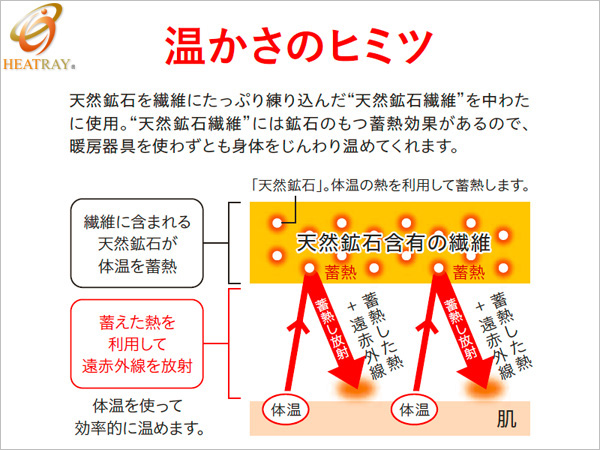 温かさのヒミツは、中わたに使用している「天然鉱石繊維」。遠赤外線を放射する厳選の天然鉱石の蓄熱効果で"自分で自分を温める"、じんわり心地よい自然な温かさを生み出す蓄熱素材です。